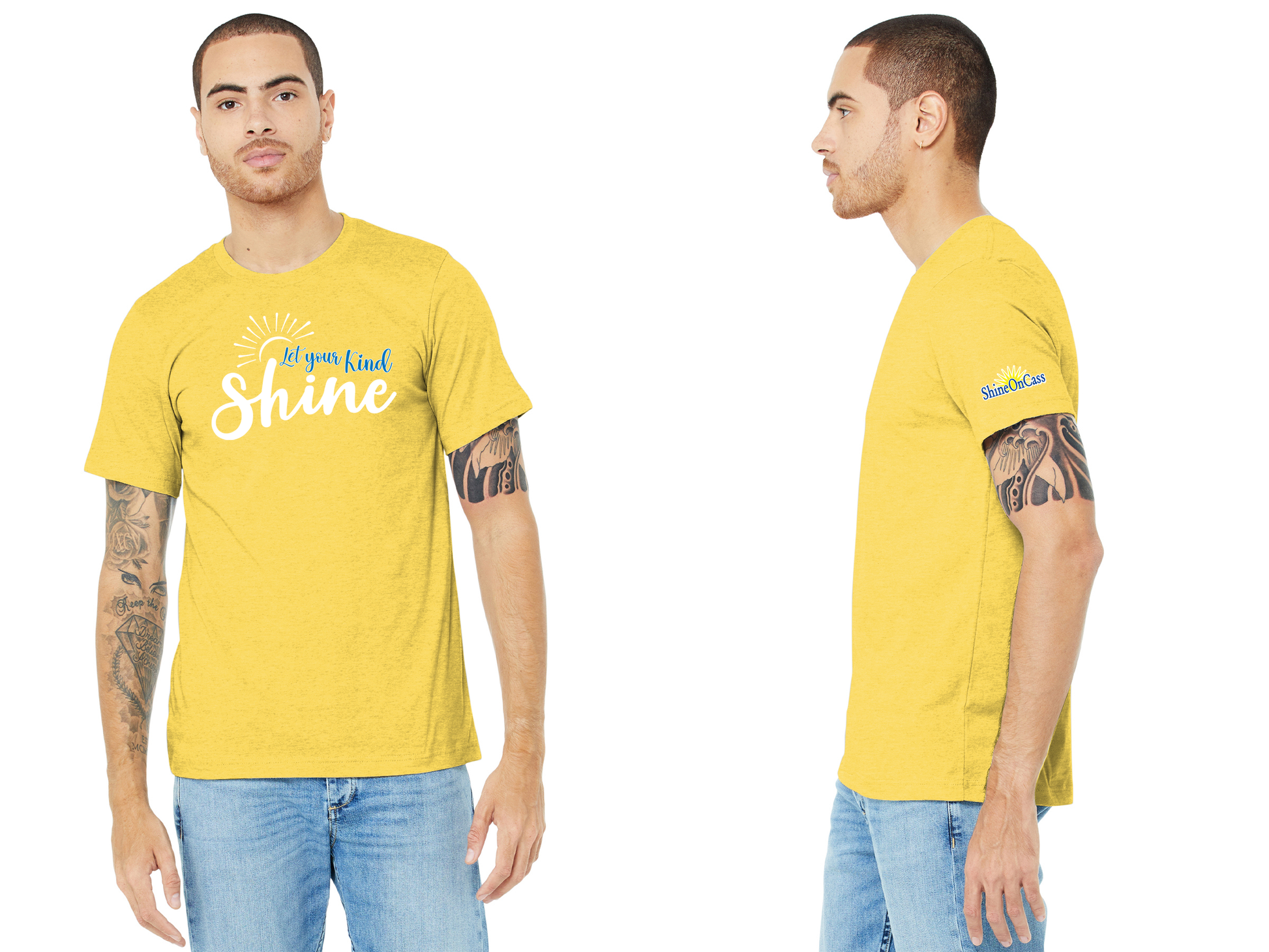 Screen printed Let Your Kind Shine logo on the chest and ShineOnCass logo on sleeve.